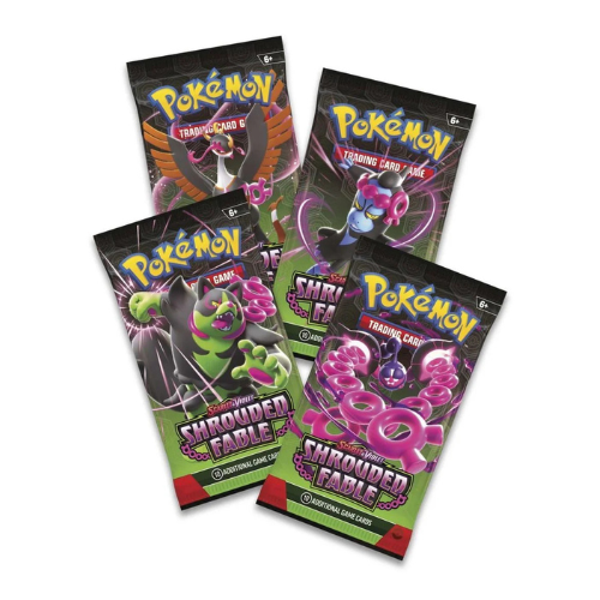- 4x Boosterpack van Shrouded Fable.- Drie exclusieve promokaarten: Pawniard (OBF 148) - Bisharp (OBF 149) en een prachtige geillustreerde Kingambit (SVP 130).